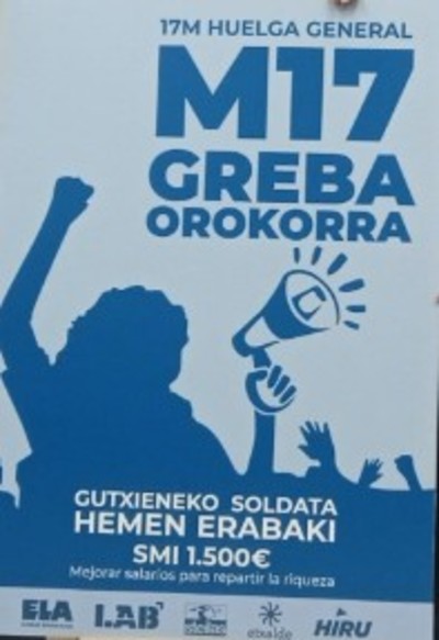 Los sindicatos ELA, LAB, Steilas, Hiru y Etxalde han convocado una huelga general para el próximo martes 17 de marzo de 2026, que afectará a todas las actividades laborales y funcionariales dentro del ámbito territorial del País Vasco y Navarra.