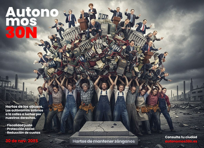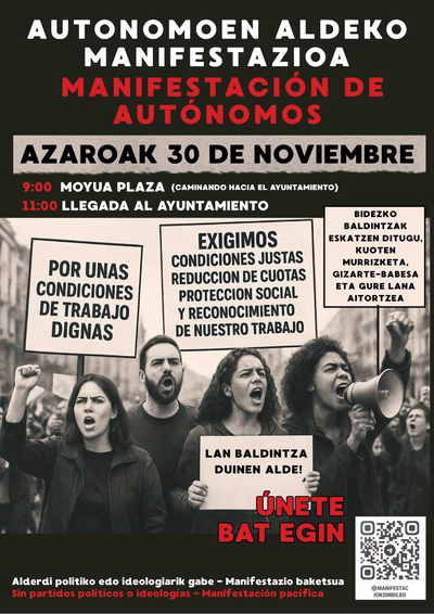 MANIFESTACION DE AUTONOMOS 30 DE NOVIEMBRE DE 2025 BILBAO 📢 Qué pedimos: 💶 Cuotas de autónomos proporcionales, ajustadas a ingresos reales mensuales 🧾 Exención del IVA hasta 85.000 € según la Directiva (UE) 2020/285 🛑 Eliminación del rol del autónomo como recaudador del Estado (IVA y cotizaciones) 🔄️ Reforma integral del cese de actividad (“paro del autónomo) 🤒Sustituciones por baja médica o cuidado familiar con cotización reducida, derecho al luto 🛡️Protección social equivalente a la de los trabajadores asalariados ✍️ Simplificación real de la burocracia y fin del lenguaje incomprensible 🏠Protección del patrimonio personal y del hogar familiar 💰Libertad de pago en efectivo y competencia justa en medios de cobro 🎶Revisión de las tarifas de la SGAE y libertad para usar música libre de derechos 🧮 Deducción inmediata de inversiones Whatsapp Facebook Twitter LinkedIn